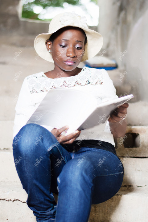belle jeune femme faisant la lecture dans les escaliers d'une maison inachevée
